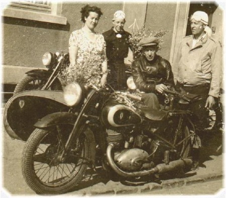 Bild unten:Foto aus den 50 er Jahren.v.l.: Gertrud Admann, Friedel Becher, Johannes Admann, Gottfried Becheru.a. Motorrad DKW 350, BJ 1940